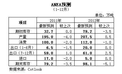 鉴于近期苗情发展不乐观,2011年产量明显调低(较上次低4万吨);受国际棉价大幅下跌影响,2012年的产量也随之调低。由于产量的减少幅度大于消费量的减少幅度,所以年末库存也低于先前的预测(2011和2012年末库存分别减少3.5万吨和5.1万吨)。
