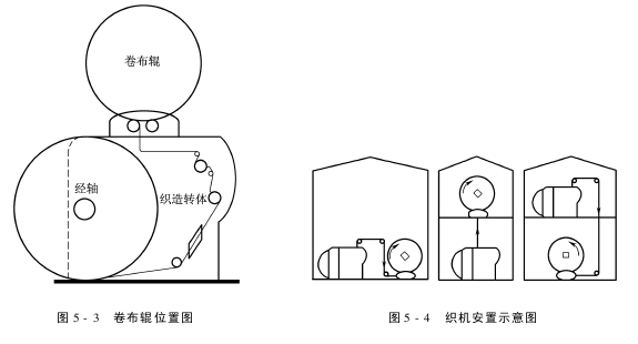 中心电气操纵元件和纬纱供给组件都集中装在机架上。依据场地面积大小,卷布装置可以安排在织机上方(图5-3)。织机的安装也可以多种形式,如图5-4所示,卷布轴可在同意条件下完可能多的设置。