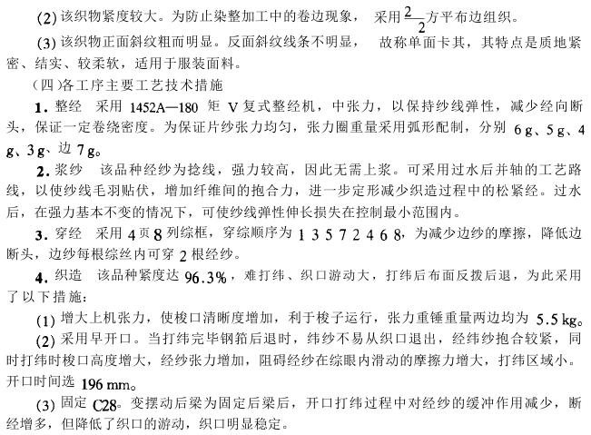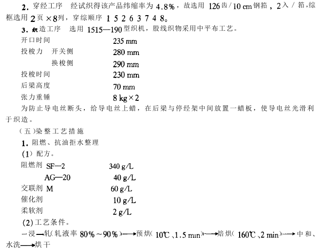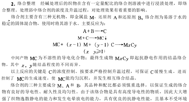 本工艺不采纳高分子有机抗静电剂,也不采纳金属或碳等导电纤维,而是采纳一种能在织物后整理过程中生成导电络合物的无机络合剂,给予合纤织物以耐久的抗静电性能。这种方法成本低、工艺操作简便、生产效率高、适用于量大面广的涤棉混纺化纤织物织物和纯涤纶织物。经此法后整理后的织物,其抗静电作用不受环境温度条件的影响,去静电性能和耐久性检测均达到或超过了国家有关标准。同时,该法对织物的手感、风格及透气性等亦无任何不良影响。