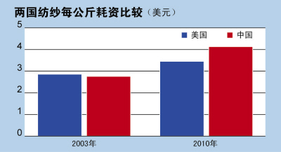 纺织业在美国的生产成本,已低于中国、印度、土耳其、韩国、巴西,近已有浙江科尔集团等一些纺企前往美国开厂。有数据显示,2003年,在美国纺纱每公斤耗资2.86美元,在中国2.76美元。而到2010年,在美国需耗资3.45美元,在中国则已跃升至4.13美元。