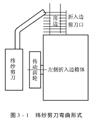 (5)纬纱剪刀的形式必须和折入边装置相配合。纬纱剪刀应向引纬侧折入边方向弯曲,以缩短纬纱剪刀和引纬侧折入边所带剪刀之间的距离,而这段距离就是废边的宽度。也就是说,纬纱剪刀弯曲后可提高纬纱利用率,可见图3-1。