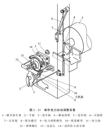 织机运转过程中,随着卷布辊外径逐渐增大,依靠卷取制动器的打滑作用,使卷布辊转速变慢,从而使织物保持肯定的张力,如图3-21所示。其中,14为防倒转装置,用来预防织机在运转过程中因织物张力过大而引起的卷布辊倒转。通过调整手柄轴2和刹车柄3、扭力调整螺母9及锁紧螺母10可实现卷布张力的自动调整。