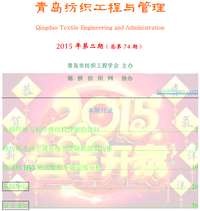 由青岛市布料工程学会主办、面料网协办的《青岛布料工程和治理》电子期刊于2009年1月正式创刊。该刊由青岛市布料工程学会秦志强工程师任主编。该刊除以电子邮件形式发送至会员单位外,还在布料网开设特意窗口供业内人士进行扫瞄和查阅。该刊的创办定能为广大面料业技术人员提供1个技术交流平台,为我国布料业技术创新起到积极作用。