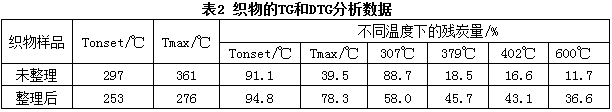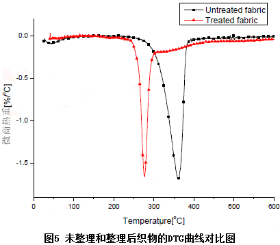 由4可以看出,未后整理和后整理后棉织物的热降解曲线趋势相同,均分为初始降解阶段、主要降解阶段和残渣降解阶段。