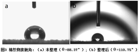 由图3可知,经(IB-N-SA)PDMS后整理后棉织物的接触角由后整理前的88.37°提高到了110.75°,说明经(IB-N-SA)PDMS后整理后的棉织物具有较好的拒水性,这是由于(IB-N-SA)PDMS和棉织物反应,以甲基为主的基团在纤维表面定向排列,形成疏水层,降低了棉纤维的临界表面张力,提高了其和水接触角。