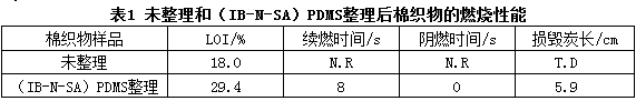 对未后整理和(IB-N-SA)PDMS后整理后棉织物的燃烧性能进行测试,结果列在表1。