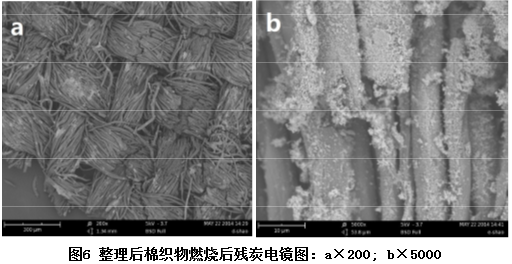 后整理织物燃烧后残炭的形貌分析结果和热重分析一致。