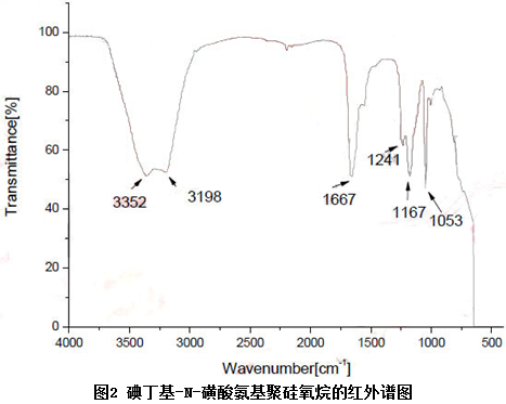 碘丁基-N-磺酸氨基聚硅氧烷的红外完谱如图2所示,1053cm-1为Si-O-Si的伸缩振动汲取峰,3352-3198cm-1为伯胺N-H的对称和不对称伸缩振动汲取峰,1667cm-1为C=N的伸缩振动汲取峰,1241cm-1为C-N的伸缩振动汲取峰,这些特征基团汲取峰表明氨基磺酸胍和带活性基团的碘丁基硅油发生反应生成了碘丁基-N-磺酸氨基聚硅氧烷。
