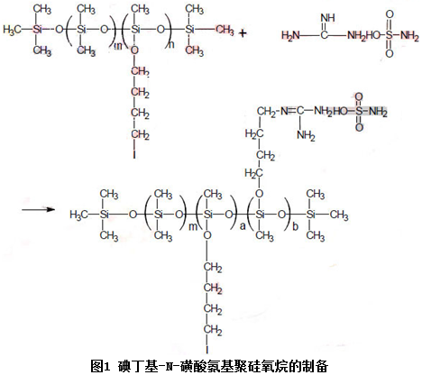 在250mL三颈烧瓶中加入氨基磺酸胍防火剂,装好一般蒸馏装置,氮气爱护,升温至80℃,滴加碘丁基硅油,在此反应温度下反应6h,冷却。反应式如图1。
