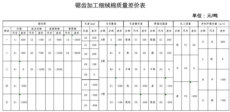 第一,新国标的计价体系在很多方面维持新旧标准之间的相对稳定,但湖南省达到交储标准的皮棉比例将会下降。就湖南省棉花而言,颜色级与品级相比较折算出的价格基本相当。去年上述棉企加工的皮棉4级占94.5%,5级占5.5%,按标准级皮棉328级收储价格20400元/吨、4级等级差3%、5级等级差13%计算,加权平均价格19737元/吨。按颜色级来划分去年上述棉企加工的皮棉中21级占0.03%,31级占9.85%,41级占20.88%,12级占0.47%,22级占54.91%,32级占13.83%,23级占0.03%。按标准级31级收储价20400元/吨,根据《锯齿加工细绒棉质量差价表》(以下简称差价表,详见附件),21、31、41、12、22、32、23级的等级差价分别300、0、-500、-100、-700、-1200、-1400元/吨计算,加权平均价格19744元/吨,较原品级标准结算价格提高7元/吨。对交储而言,原国标5级以下不能交储,比例是5.5%,若新国标32级以下不能交储,比例达到13.86%,湖南省不符合交储标准的棉花比例(仅指级别)将上升8.36%。