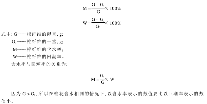 含水率是指在规定条件下测得的棉纤维水分的重量对棉纤维湿重的比值,以试验试样的湿重和干重的差值对湿重的百分率表示。回潮率是指在规定条件下测得的棉纤维水分的重量对棉纤维干重的百分率,以试验试样的湿重和干重的差值对干重的百分率表示。