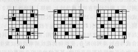 答:绘制方格组织织物组织图,欲使位于对角位置的组织点连续,采取的方法为:应使基础组织根和末根经纱上的两个组织点距上、下边缘相等,使根和末根纬纱上的两个组织点距左、右边缘相等。为此,可以通过观看基础组织相邻两根经(或纬)纱的方法,来寻出适合于作根和末根的经纱(或纬纱)。现以一纬面缎纹为基础组织为例来说明,如图2-14(a)所示,经观看,第6、第7两根纬纱上的两个组织点距左、右边缘相等,如图中箭头所示,故取第7根纬纱作为根纬纱,第6根纬纱作为第8根纬纱(也可以取第3根作为第1根纬纱,第2根作为第8根纬纱)。同理第2、第3两根经纱上的两个组织点和上、下两边缘距离相等,如图中箭头所示,故以第3根作为第1根经纱,第2根作为第8根经纱(也可取第7根经纱作为第1 根,第6根作为第8根经纱)。经如此调整后的基础组织如图2-14.