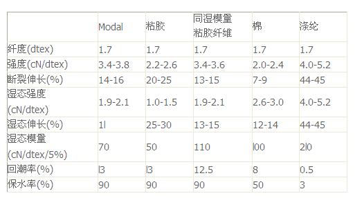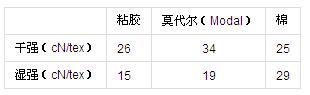 ⑴莫代尔(Modal)具有高强力纤维均匀的特点,湿强力约为干强力的50%,优于粘胶的性能,具有较好的可纺性与织造性。粘胶、莫代尔(Modal)、棉的干湿强度对比见表:
