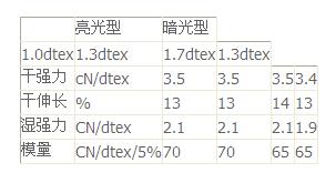 莫代尔纤维具有亮光型和暗光型,其产品规格及其物理性能如下: