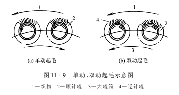 织物运行方向相同,如图11-9(a)所示。调节针辊转速,可获得不同的起毛效果。