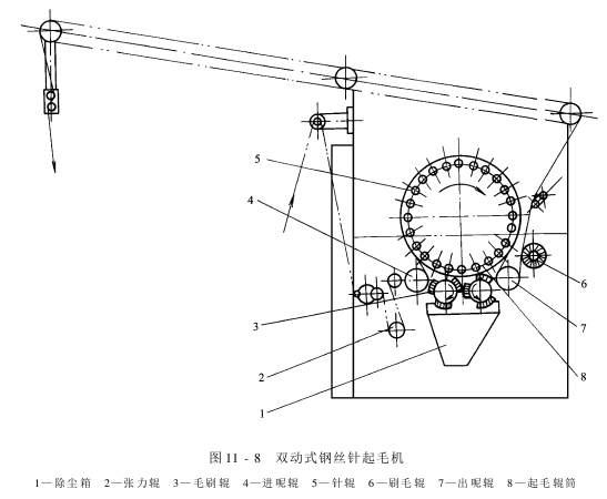 根据针辊上针尖方向的不同,钢丝针起毛机可分为单动式和双动式两种。主要由起毛辊筒、刷毛辊、导辊、针辊、吸尘箱等组成。
