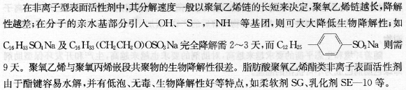 两性离子型表面活性剂因本身毒性小,因而考虑生物降解性较少,然而一些合成的两性离子型表面活性剂生物降解性很好,如咪唑啉两性离子表面活性剂水溶液在12h内生物降解率大于90%。有些两性离子型表面活性剂如卵磷脂类,本身是一种天然产物,不仅无毒,生物降解性极高,而且还是一种营养剂。