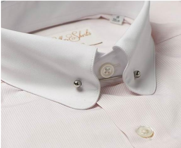 领针领正式的衬衫之一,适合佩戴细领带,领口由领针固定后压在领带下,显得特别严谨,但因为领针的款式多变,又略显风骚。
