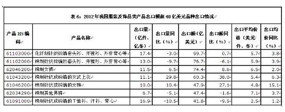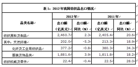 由于2012年国内原材料价格和劳动力成本不断攀升,导致我国纺织出口企业的竞争力严重下降。据新数据统计显示,2012年全年我国仅纺织原料及制品、服装及饰品类产品出口呈现增长;天然纤维类产品、化纤及工业用纺织品类产品、纺织机械产品均呈现下降趋势。
