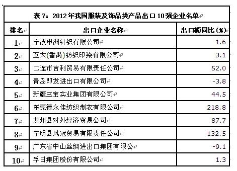从出口企业情况来看,我国服装及饰品类产品出口集中度与纺织原料类产品相比更为分散,出口额排名前10位企业出口额合计仅占同期出口总额的3%(详见表6)。
