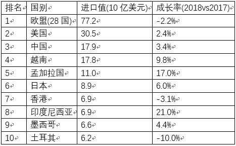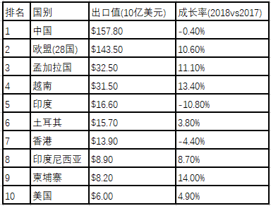 如(表三)所示,按值计算,2018年欧盟(28国)、美国、中国位列全球前三大纺织品进口国,占全球进口总值的37.5%。虽其市占率接近上年的37.7%,但仍远低于2000年50%以上。