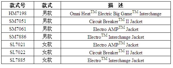 此次被召回的2012秋季款哥伦比亚电热冲锋衣分男款和女款,聚酯纤维材质,“Columbia”标在衣服正面左边,衣服内部有两块电池组,款式号标在白色警示标签上。具体的款式号及描述分别为: