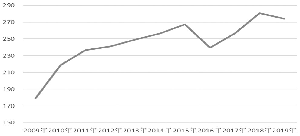 图为欧盟10年间纺织品进口额走势(单位:亿欧元)