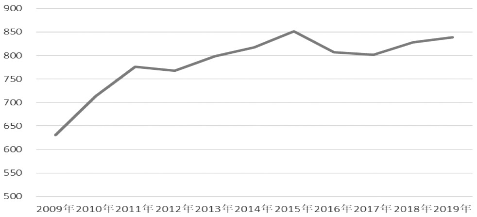 美国服装进口金额在10年间也整体呈增长趋势,2019年美国服装进口额838亿美元,较2009年的631亿美元增长32.8%。