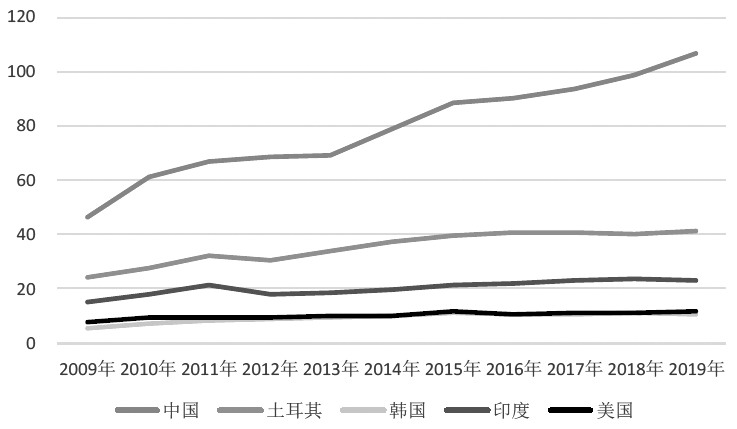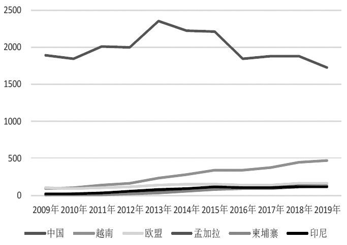 近些年,全球纺织服装贸易流向悄然发生变化,中国作为大的纺织品出口国和服装出口国,在产业链中占据着重要的一环。因国际关系变动,及越南、孟加拉国、印度等国纺织服装产业链崛起,国际纺织服装贸易出现转移现象,中国纺织品及服装出口份额在部分地区被挤占,开始下滑。本文选取中国、欧盟、美国、日本作为研究目标,分析10年间中国纺织品及服装出口的变化及欧盟、美国、日本进口的变化。欧盟、美国、日本是中国大的纺织品及服装出口地,同时也是全球纺织服装贸易中举足轻重的环节,选取它们作为研究对象能够更直观地展现全球纺织服装产业链变化趋势。