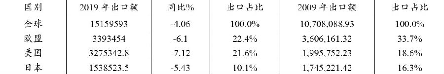 表为2009年和2019年中国服装主要出口分布(单位:万美元)