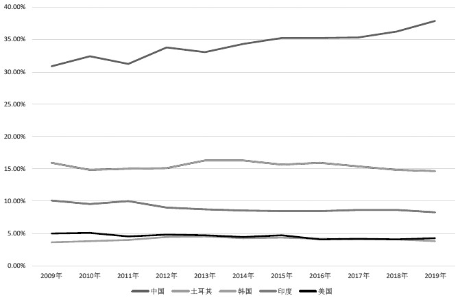 纺织品进口:中国份额大但10年来占比变化不大,印度占比缓慢提升