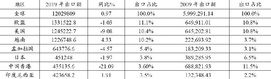 表为2009年和2019年中国纺织品主要出口分布(单位:万美元)