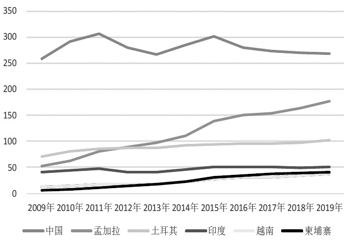 由此可以看出,在这10年间,越南服装产业不断壮大,产量及出口逐年提升,从某种程度来说,越南作为新兴的服装生产及出口国与中国存在竞争关系,抢占中国服装出口份额。2019年这一情况更加明显,美国自中国服装进口金额占比同比下滑3.3%,越南同比增加1.43%,两者在2019年的增幅均是10年间大的一年,由于美国对来自中国的纺织品服装加征关税,美国服装下游企业减少对中国服装的进口,转而增加对越南的服装进口。其他进口国方面,孟加拉国、印度尼西亚、印度在10年间对美国的服装出口金额均是逐年增长的,但曲线较越南平坦许多,占比方面,只有孟加拉国整体增长,2019年较10年前增加1.75%,印度尼西亚占比先增后减,整体波动不大,印度占比10年间波动不明显。