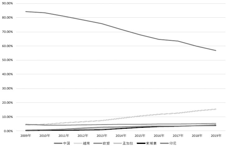 通过对2009年与2019年的数据进行对比,可以发现中国对欧盟、美国的纺织品出口占比在10年间变化不大,对中国香港的纺织品出口占比下滑明显,减幅8%,对越南出口占比在10年间增长6.5%,从2009年的3.7%增长到2019年的10.2%。