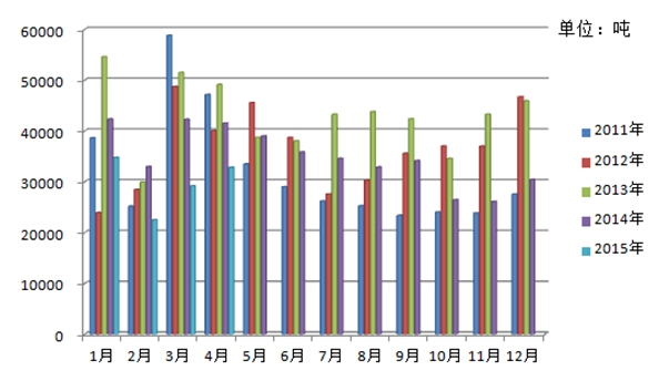 由图1可见,每年我国进口棉纱数量会在3-5月和8-9月这2个传统纺织旺季达到高峰。2015年1-4月我国棉纱进口数量再创新高,不断增加的棉纱进口数量和进口棉纱关税有望降低的消息是否会推动棉纱进口量再创新高?