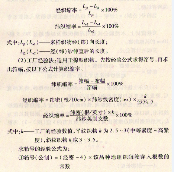 (1)织物分析测算法:分析来样的经纬织缩率按下式计算: