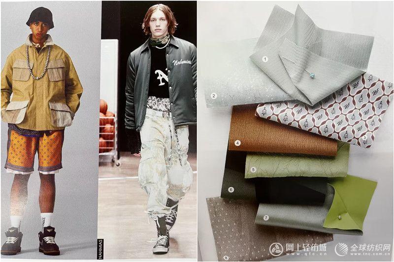 对元宇宙的想象和体验感被呈现在实物当中,通过色彩、图案与科技的融合,演绎具有街头或机能风格的前卫时尚造型。针织面料结合像素艺术呈现混色迷幻效果可制作显露酷炫街头风的卫衣和打底层;毛型、棉型材质以变形格纹、复古冲突感小几何、艺术化染色外观为主,带有浓墨重彩的阴影效果,用于西装、衬衫后,可打造出派对或音乐节造型;涤纶、尼龙、基布结合动感起伏的光泽,探索富有感染力的未来主义风格,标志性的印花或提花设计呈现出复古与科技融合的冲突感,令夹克和防护装备映现超凡视觉。