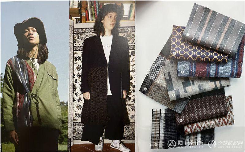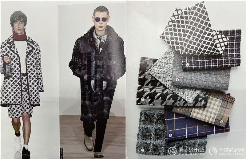 色彩、肌理、纹样的更新使经典品类呈现趣味新意的视觉效果,同时保留了具有传承魅力的熟悉感。花呢外观面料具有结实耐用、可塑性强的特点,通过使用丰富的色彩,并结合混色纱、竹节纱、强捻纱、彩点纱等造就多样化的混色、斑点、苔藓效果,重塑经典单西、套西、夹克、大衣的风格。