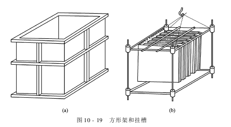 方形架上色机是由挂染槽和星形架的优点综合而成的,其作用和星形架相似,但挂绸比较方便。如图10-19所示。染槽是一方槽,吊架换成了方形架,平幅织物整匹用钢针将两边拴住,每隔数层分开挂在方形架上,每架可挂50g/m2的织物9匹(每匹长40~50m)。用电动吊车把方形架吊入染槽,每个染槽容积1800L,可把方形槽编为一组,成为一条上色生产线。其中,上色槽特意上色(上色残液可续用),后处理槽特意用于水洗及后处理,这样可大大提高生产效率。方形架上色机适用于全真丝织物的上色,其挂绸操作较星形架方便。织物呈松式平幅状态,因而不易擦伤,而且染液的渗透性良好,使上色织物完泽柔和,手感柔软饱满。但此设备容绸量较小,产量较低,也可能产生“刀口印”等疵病。