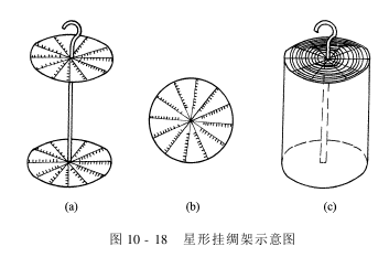 星形架上色机,是目前国内外仍采纳较多的丝织物上色设备之一,如图10-17所示。它主要是由一只大上色槽和一个挂绸星形架组成。染槽呈圆柱形或方形,用不锈钢材料制成,可直接和间接加热,还备有循环泵,可使染液循环。织物被一层层挂在星形的挂绸架上,所谓星形架是一只两头有圆盘的金属架。如图10-18(a)所示。圆盘的连接档上装有许多挂钩,织物就挂在钩上。如图10-18(b)和图10-18(c)所示。因为挂绸钩之间相隔肯定的距离,所以织物层和层之间也相隔肯定距离而互不相碰,由于圆盘的横档通过圆心向外伸展呈放射形似星状,故称星形架。