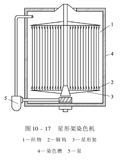 星形架上方装有电动吊车,可上下左右移动。上色时将挂有织物的星形架吊入染槽,上色开始或在上色过程中,根据需要可将星形架上下起落,或开动循环泵,让染液循环,使上色均匀。
