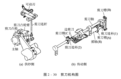 (2)传动侧剪刀机构(右侧):安装在织口前的边撑杆前侧。当纬纱的末端和捕边纱交错后向织口方向移动抵达剪刀处,剪刀将纬纱剪断,捕边纱和布分别并被捕边卷取机构回收到废边纱桶中。将大于布幅的多余纬纱从布边上剪除的目的是使布边整齐美观。机构见图2-30(b)。
