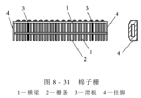 棉子栅由横梁和栅条组成,如图8-31所示。横梁为两根25mm宽的扁钢,上面钻有等距离的孔,孔径根据钢丝粗细而定,钢丝穿入横梁孔中铆紧,使栅条不致松动,并均匀地排列在两横梁上。栅条间净距应大于棉子腰径,一般在7.5mm左右。栅面上有两条扁钢,为推花板跑道(或滑板)。棉子栅两端装有薄钢板挂脚,挂脚上有长方形眼孔,用以调整棉子栅的位置,以螺钉固定在机架墙板上。
