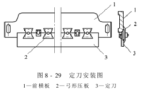 前横板以生铁铸成,两端用螺栓固定在左右墙板的上部,作为机架的横梁。板的下端铣出一道平直的和定刀等厚的阶梯槽,用来安装定刀。前横板的上部水公平距离地排列着若干个孔,供安装弓形压板时使用。定刀夹在前横板和弓形压板之间得以固定,通过调节弓形压板螺栓,可调整定刀对皮辊的压力,定刀安装图如图8-29所示。
