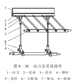 动刀也是由低碳钢板制成的,其宽度为90~95mm,厚度为3~4mm。动刀及其连接件如图8-30所示,动刀刀背铆装在托座上,托座侧面均匀平齐地开了5个圆孔,5根撑杆一端插入托座圆孔内,并用螺栓固定,另一端车成螺纹,穿入矩形截面的五眼轴内,以螺母旋紧。五眼轴两端固定在两侧的墙板上。托座下端装有托环襻,由此连接连杆。