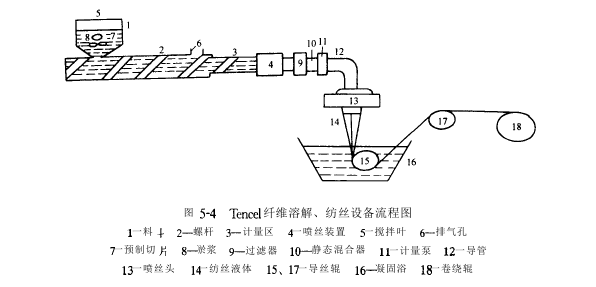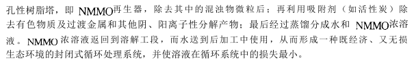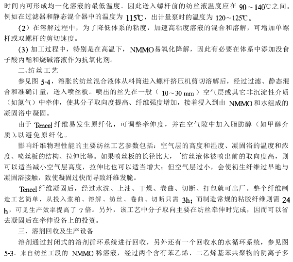 Tencel纤维的生产工艺和粘胶纤维生产工艺相比,不需要经过化学反应,纤维素分子幸免了因化学反应而引起的降解。此工艺为:首先将木浆粕溶化在NMMO溶剂中,并除杂过滤;接着采纳干喷湿纺工艺进行纺丝;然后对丝进行水洗、干燥、卷曲和切断,同时将几乎100%的NMMO溶剂回收后再利用。工艺流程如图5-3所示。