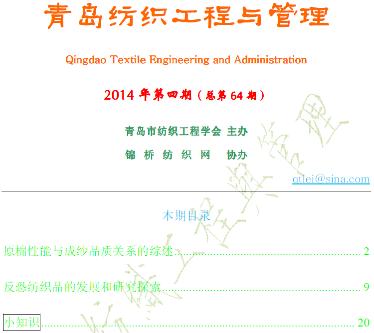 由青岛市面料工程学会主办、面料网协办的《青岛面料工程和治理》电子期刊于2009年1月正式创刊。该刊由青岛市布料工程学会秦志强工程师任主编。该刊除以电子邮件形式发送至会员单位外,还在面料网开设特意窗口供业内人士进行扫瞄和查阅。该刊的创办定能为广大布料业技术人员提供1个技术交流平台,为我国面料业技术创新起到积极作用。
