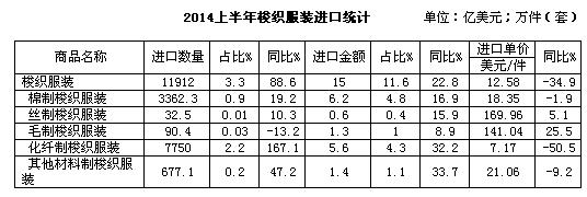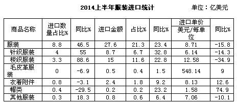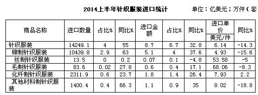 1.针织服装上半年针织服装进口1.4亿件(套),同比增长55%,各类针织服装进口量均有增长;进口均价同比下滑14.3%,为6.14美元/件(套),其中,仅化纤制针织服装进口单价增了2.2%。进口数量的大幅增长是上半年针织服装进口额增长32.8%的主要原因。