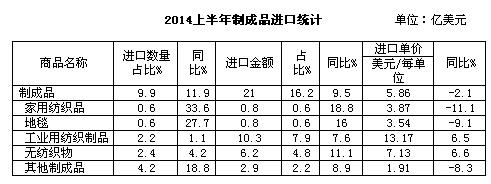 上半年纺织品进口总额为102亿美元,同比下滑1.6%,进口数量同比下滑5.4%,纱线、面料进口额均出现下滑,制成品进口有增长。