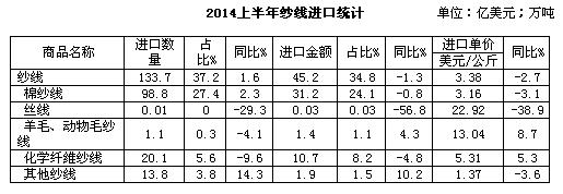 (一)棉花价格政策的调整对棉纱线进口造成冲击。曾经高企的国内外棉价差大幅收窄,首先是加诸在企业身上的棉纱线原料成本的压力消退了很多,随之消弭的是企业对于进口棉纱线的热度。其次,棉纱线进口数量正在逐步接近国内市场需求的临界,据国家统计局统计,2013年国产纱线3200万吨,预计2014年国产纱线产量不会低于这个数字。上半年棉纱线进口总量略增,综合棉纱线进口单价及进口金额来看,棉纱线已经失去了一度主导纺织服装进口的决定性地位。